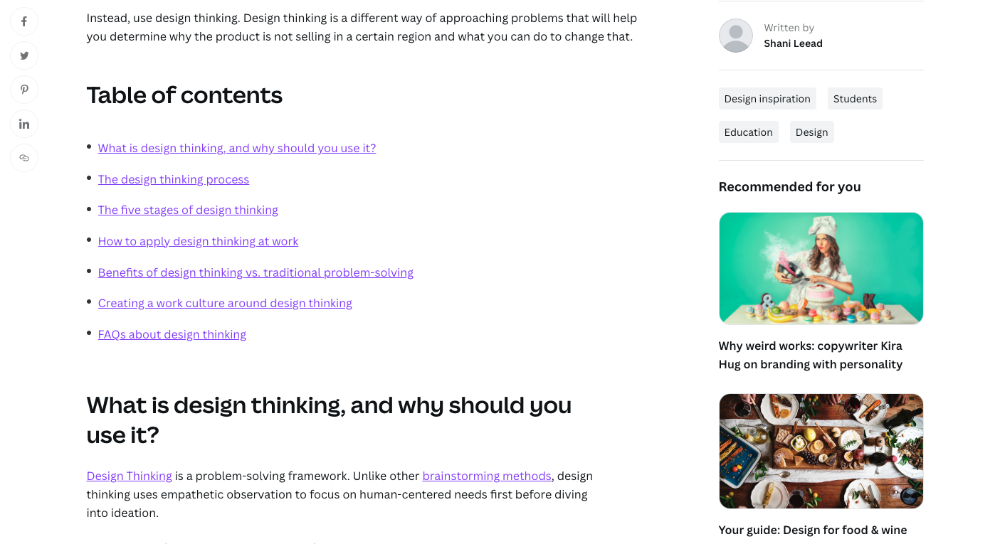 Example: This blog layout by Canva makes great use of space:- Social buttons are prominent for sharing.